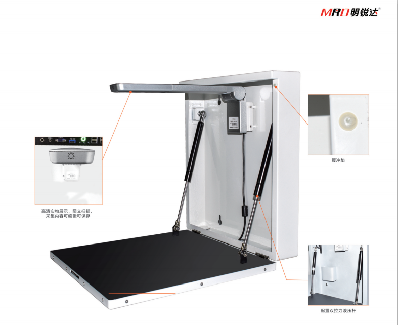 MRD-BL500L參數(shù)?1、 ★壁掛式結(jié)構(gòu),采用機(jī)械鎖保護(hù)展臺(tái),打開平臺(tái)門鎖后有緩沖裝置將展臺(tái)移置水平位置,可將A3、A4規(guī)格的課本放在上面展示,液壓桿拉門設(shè)計(jì),關(guān)門時(shí)實(shí)物展示臺(tái)收縮起來不外露。2、 4.1(實(shí)測(cè)15FPS)500萬像狀態(tài)下可達(dá)到高流暢度,1080P實(shí)測(cè)30FPS,均為實(shí)測(cè)速度,非虛標(biāo)的理論值;進(jìn)口500萬像素 CMOS高速高清傳感器3、 4.2頭部外殼頂部離紙面的距離